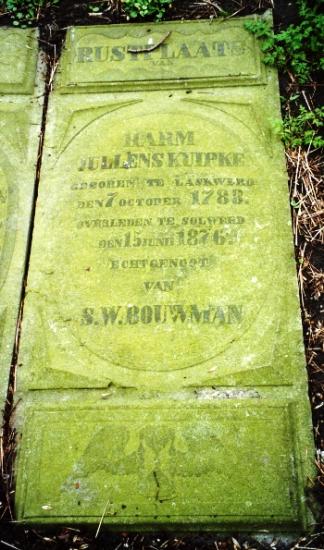 RUSTPLAATS HARM JULLENS KUIPKE geboren te Laskwerd den 7 october 1788. overleden te Solwerd den 15 juni 1876. echtgenoot van S.W. BOUWMAN In zijn trouw- en overlijdensakte staat dat hij Harm Julles Kuipke heet.